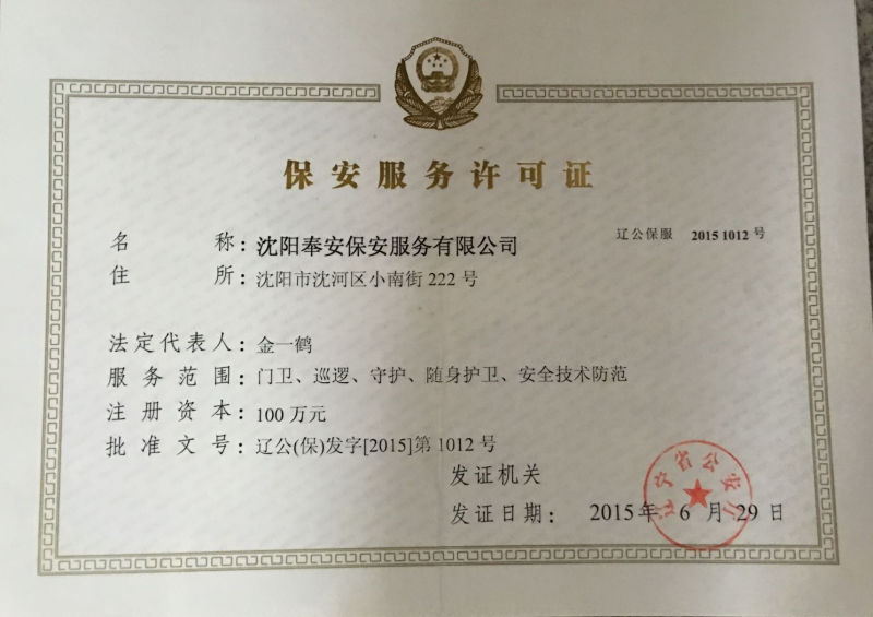 沈陽奉安保安服務有限公司(原沈陽市沈河區保安服務公司)創建于一九八八年八月,是遼寧省公安廳、沈陽市公安局批準,工商行政部門登記注冊,全市首家具備保安資質的特殊性服務企業,隸屬于沈陽市沈河區政府直管的全民國有企業,現為中國保安協會會員單位和省保協、市保協常務理事單位:在全市同行業中率先通過ISO國際質量認證,是市工商局批準的“重合同守信用”免檢單位和沈陽市政府采購中心保安服務項目重點競標單位;擁有一支專業化、標準化、職業化的高素質保安隊伍,是公安機關重要的輔警力量。